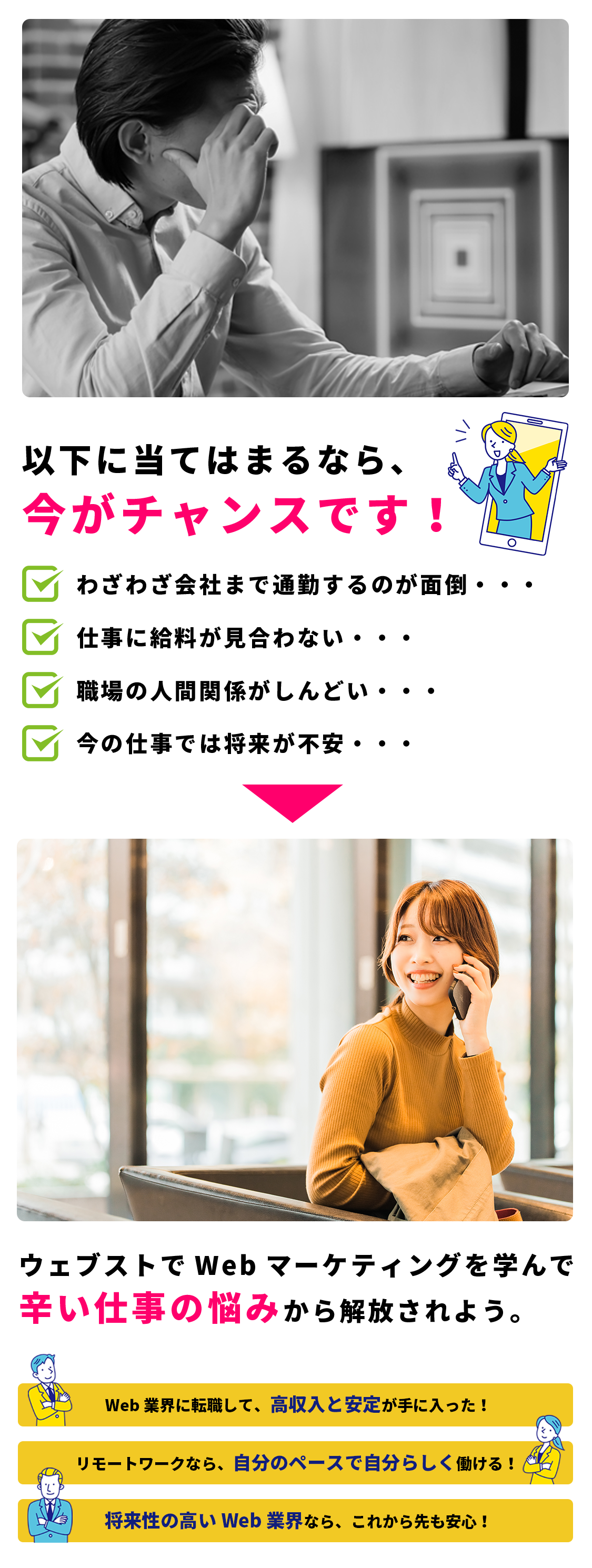 まずは副業でWebマーケティングを実践し、自分の力で収入を作る力を身につけます。本物の高単価案件で実務経験を積み、Web業界への転職・起業を叶えましょう!