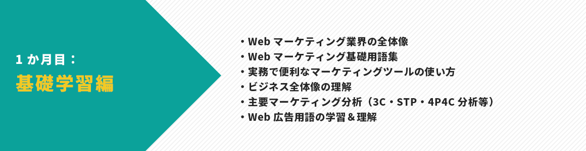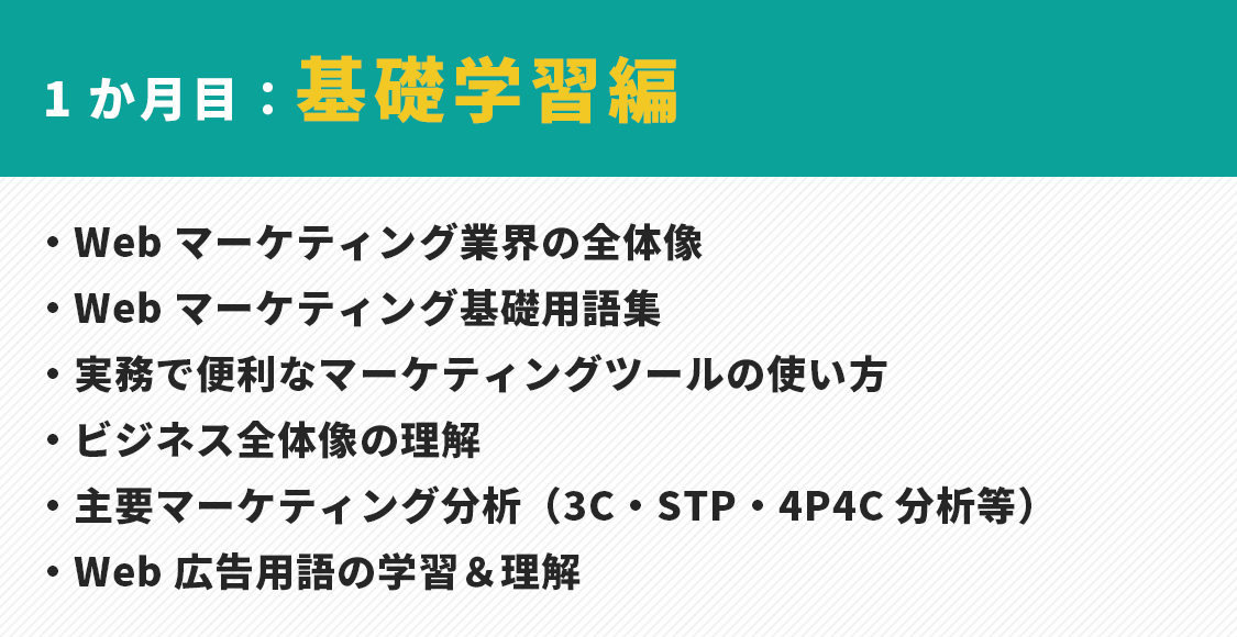 大丈夫です。1か月目の基礎学習編では、Webマーケティングに関する用語から解説しています。