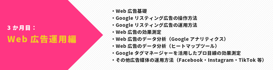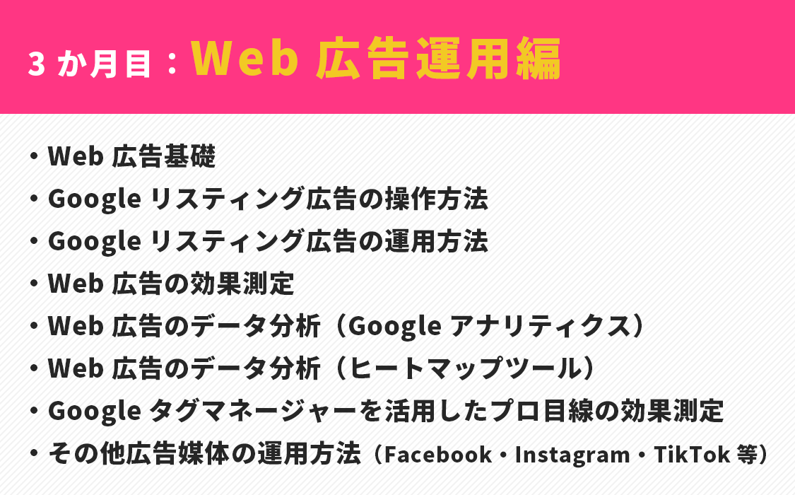 未経験からでも学べるよう、Webマーケティングの基礎からじっくり進めるカリキュラムになっています。